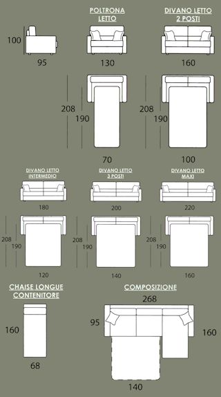 Divano letto trasformabile con meccanismo "tipo spider" a rete elettrosaldata e materasso a molle. Dimensioni Misure cm 130 (rete cm 70) cm 160 (rete cm 100) cm 180 (rete cm 120) cm 200 (rete cm 140) cm 220 (rete cm 160) x P cm 95 x H cm 100 Letto aperto cm 208